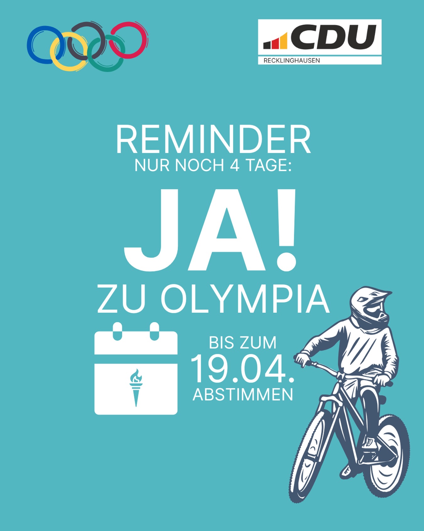mehr🗳️ Bürgerentscheid in Recklinghausen: Ihre Stimme für Olympia! Bis zum 19. April 2026 entscheiden die Bürgerinnen und Bürger in Recklinghausen per Briefwahl über die Olympia-Bewerbung der Rhein-Ruhr-Region. Der Rat der Stadt hat den Bürgerentscheid einstimmig beschlossen ? denn klar ist: Moderne und nachhaltige Spiele kann es nur mit dem Willen der Menschen vor Ort geben. 📬 So funktioniert die Abstimmung: ? Ausschließlich per Briefwahl ? Wahlberechtigt: EU-Bürgerinnen und -Bürger ab 16 Jahren ? Voraussetzung: mindestens 3 Monate wohnhaft in Recklinghausen 🏅 Chance für unsere Stadt: Gemeinsam mit Herten könnte die Halde Hoheward Austragungsort für Mountainbike-Wettbewerbe werden ? eine große Perspektive für unsere Region! 👉 Nutzen Sie Ihre Stimme für Recklinghausen! #Recklinghausen #Bürgerentscheid #Olympia #Briefwahl #ZukunftVorOrt