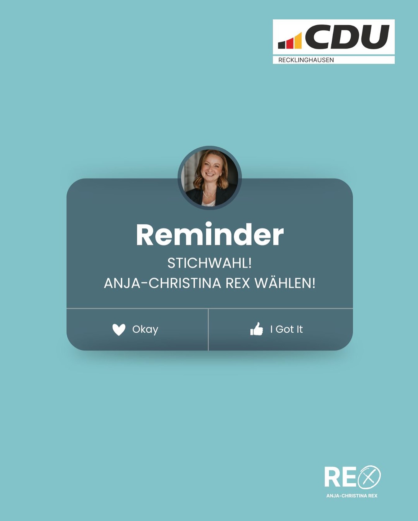 mehrHeute ist es soweit: Stichwahl in Recklinghausen! Geben Sie Ihre Stimme Anja-Christina Rex ? für eine Bürgermeisterin, die zuhört, anpackt und mit Klarheit und Verlässlichkeit für unsere Stadt einsteht. ➡️ Jede Stimme zählt! #anjarex #anja2025 #meinre #recklinghausen #cdu #stichwahl #kommunalwahl